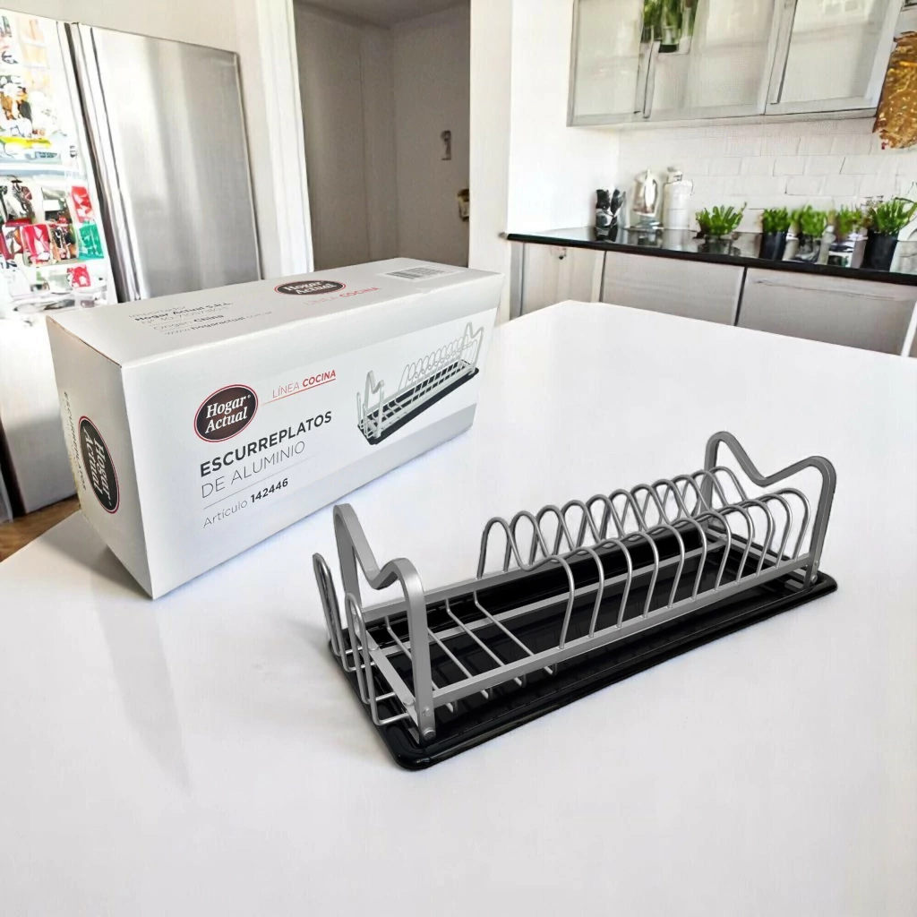 El escurridor de platos HOGAR ACTUAL modelo 446 ALUMINIO es la solución ideal para mantener tu cocina organizada y funcional. Diseñado para colocarse sobre la mesada, su estructura de aluminio y polipropileno garantiza durabilidad y resistencia ya que no se oxida , mientras que su elegante acabado se adapta a cualquier estilo de cocina.