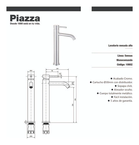 Grifería Para Lavatorio Alto Piazza Sensus Cromo 10802