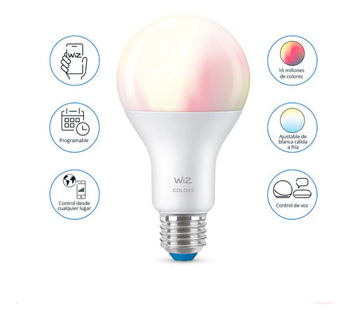 La lámpara Full Color WiZ LED brinda iluminación inteligente para tu vida diaria. Crea el ambiente que desees con 16 millones de colores y luz blanca cálida a fría. Puedes establecer un horario para encender y apagar las luces de acuerdo con las rutinas diarias o semanales, controlar con tu teléfono inteligente o tu voz y tener acceso remoto a tus luces incluso cuando no estés. Las luces WiZ se conectan a tu Wi-Fi existente, no se necesita ningún hardware adicional.