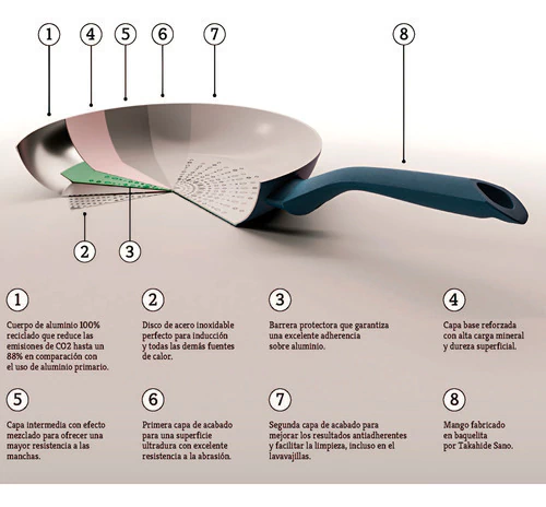 Una innovación diseñada con mayor atención al medio ambiente, ya que el revestimiento se realiza con un ciclo de producción más sostenible (en comparación con los revestimientos antiadherentes tradicionales de PTFE). Además, el cuerpo es de aluminio 100% reciclado, lo que se traduce en hasta un 88% menos de emisiones de CO2 en comparación con el uso de aluminio primario.
