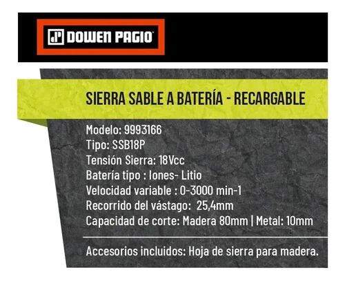 Sierra Sable Inalambrica Dowen Pagio 18v Litio 9993166 80 Mm