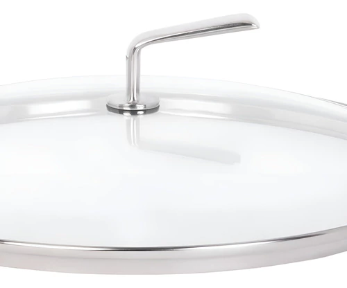 Tapa de cristal con borde y pomo de acero y válvula de ventilación de vapor para tener siempre bajo control la cocción.