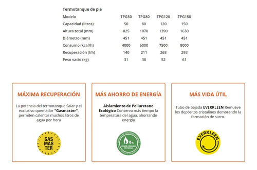 - Saiar TPG120MSA es un termotanque a gas con capacidad para 120 litros. A diferencia de un calefón, permite tener agua caliente sin depender de la presión general, aún con el uso simultáneo de varias canillas. Su sistema de aislación de poliuretano ecológico le da mayor vida útil y menos consumo de gas que otros equipos que utilizan como aislante la lana de vidrio. Este equipo es para ser instalado de pie.